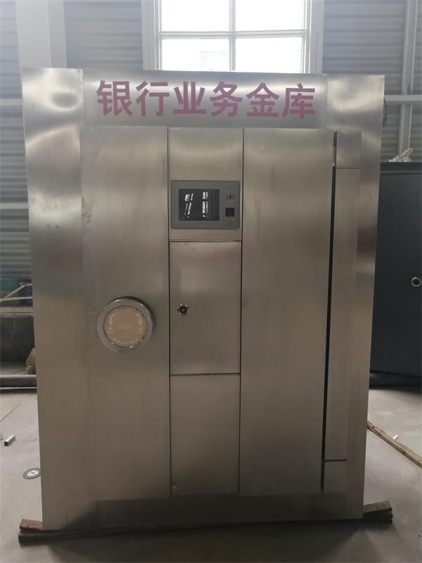 銀行業(yè)務(wù)金庫由分塊的壁板組合而成,壁板間相互咬合、再從庫內(nèi)用螺栓加固,庫外經(jīng)裝修處理后沒有可視的拼縫或間隙;整個庫體六面壁板設(shè)計結(jié)構(gòu)基本*;外層為8mm優(yōu)質(zhì)防爆鋼板、在內(nèi)側(cè)焊上鋼板網(wǎng)并澆鑄特種填充料防護層,再填充70mm厚的高性能防火保溫材料,zui后用進口鋼板封閉成整塊具防火、防鉆、防撬、防割功能為一體的成品板塊;總壁厚達200mm以上;每平方米成品板塊自重150kg。也可根據(jù)用戶實際需求設(shè)計制成較為輕便的板塊。